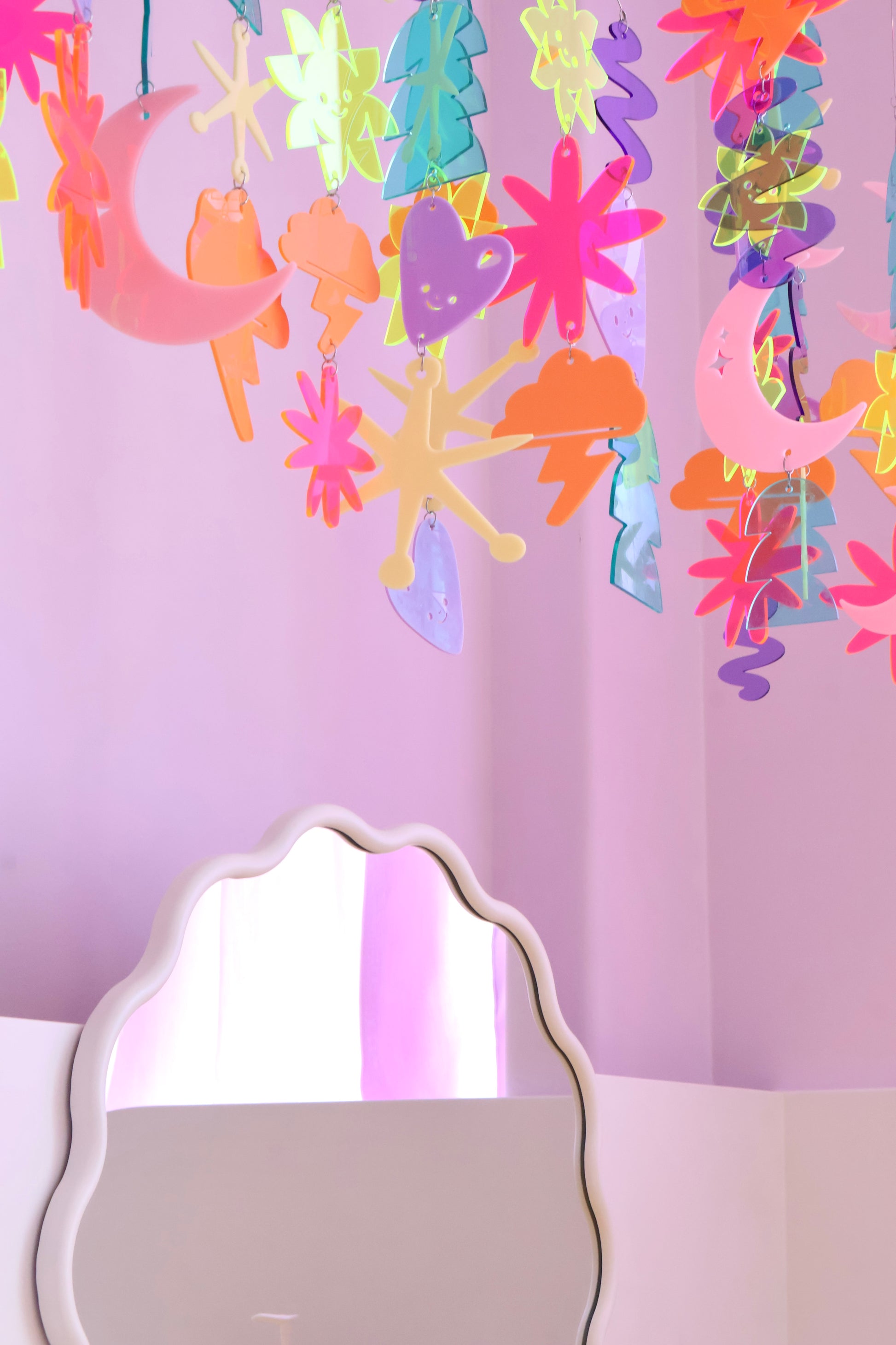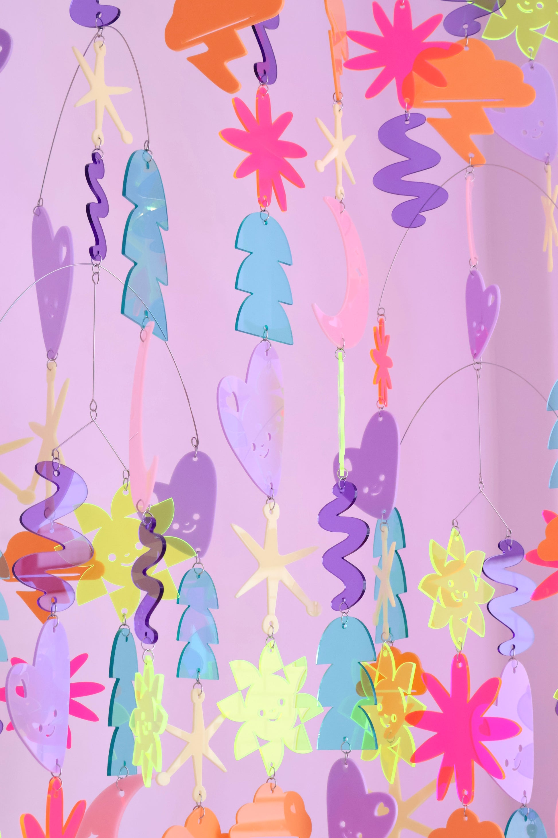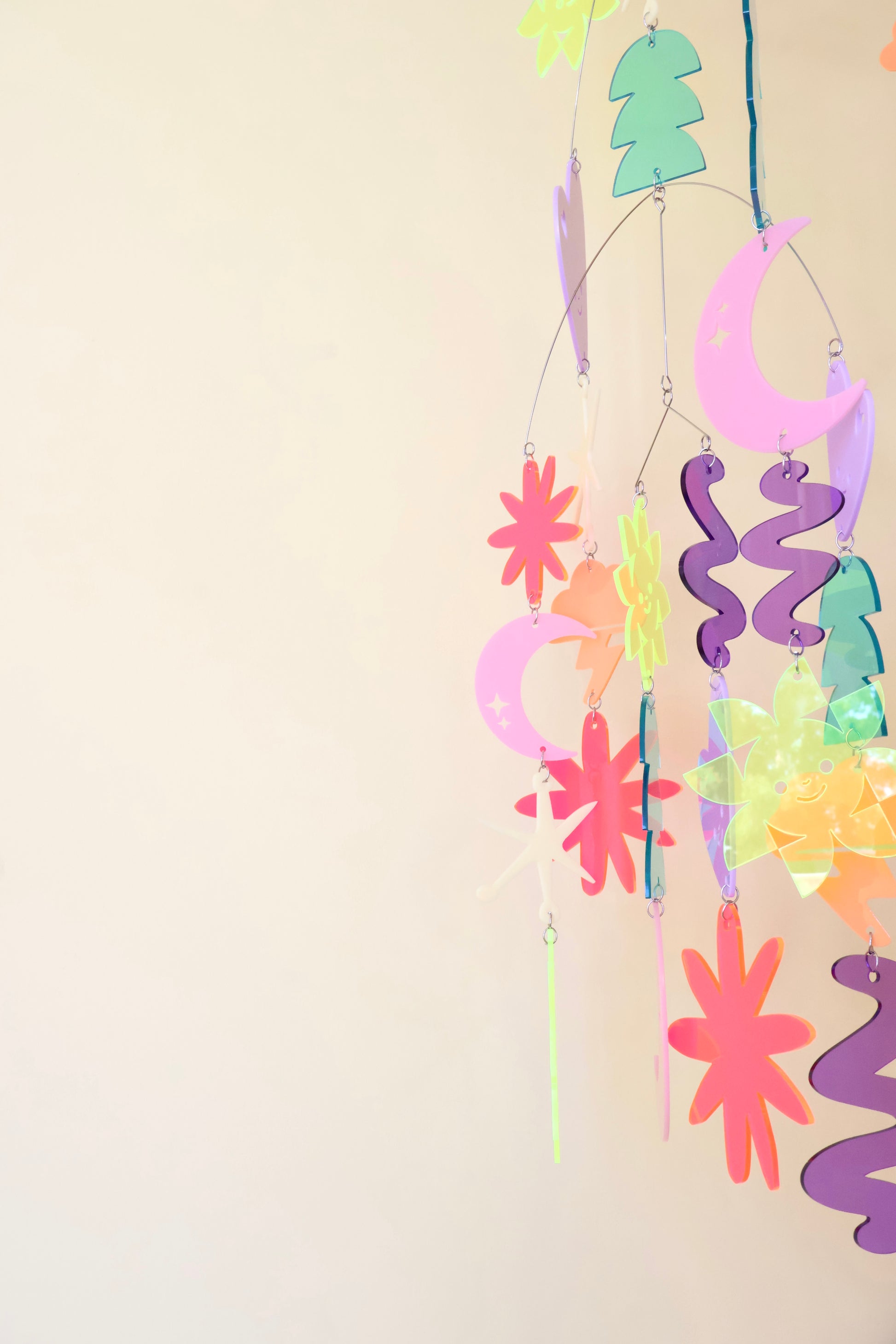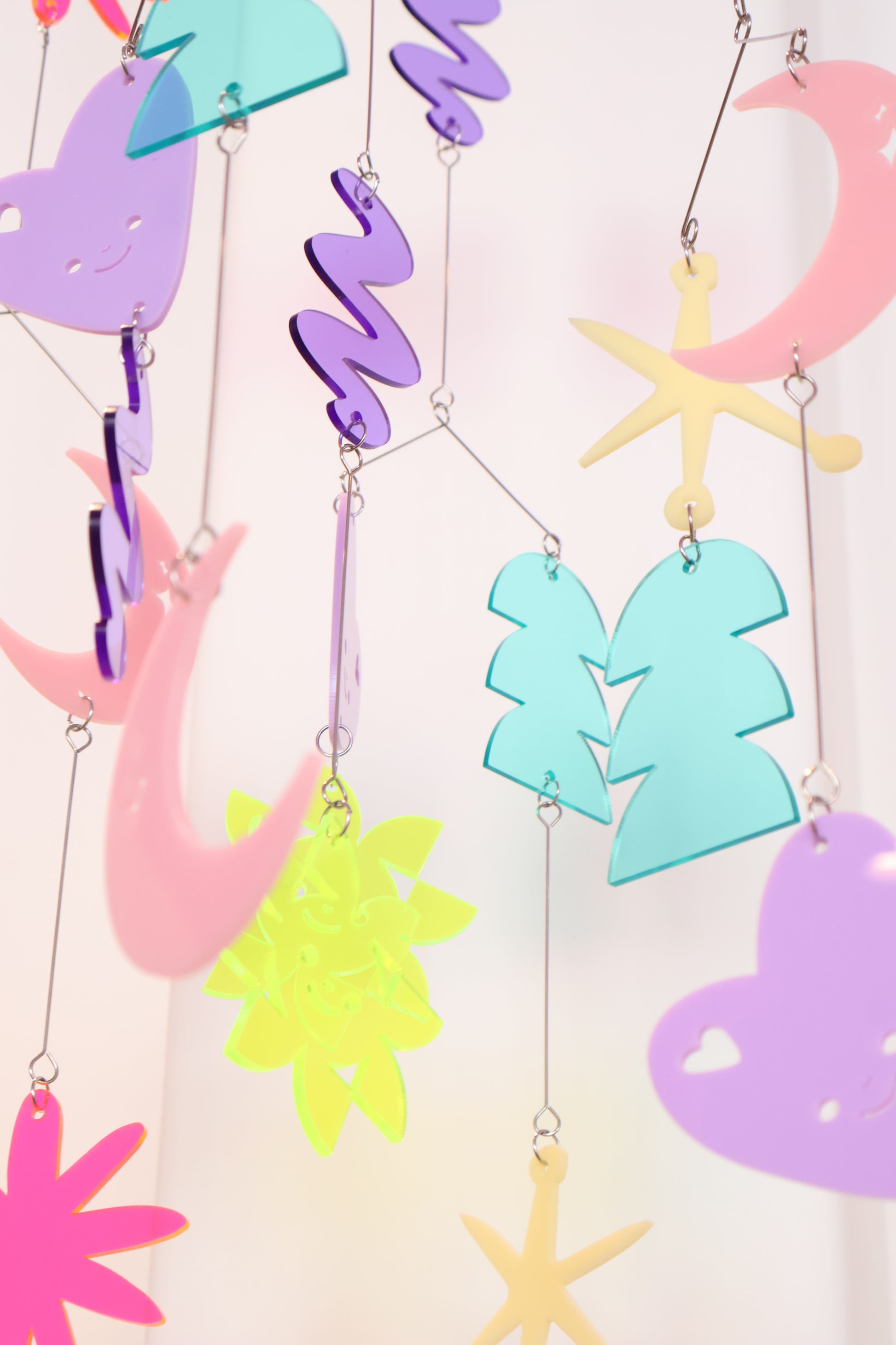 Introducing our handcrafted Acrylic Dynamic Mobile, a vibrant piece made from eight stunning acrylic colours and eight unique shapes. Assembled with care and ready to hang, this mobile adds a touch of artistry to any space.